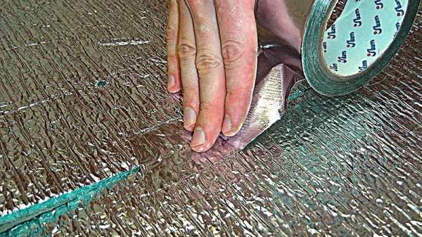 В качестве теплоизолирующего материала необходимо использовать легкий материал — фольгированный пенофол, толщина которого достигает 14 мкм толщиной, с клеящим слоем. У изделия хорошие свойства, коэффициент его теплопроводимости — 0,049 Вт/мК. Фольгированный теплоизоляционное изделие продается в рулонах, после чего он укладывается фольгированной стороной вверх, а его стыки проклеиваются строительным скотчем.