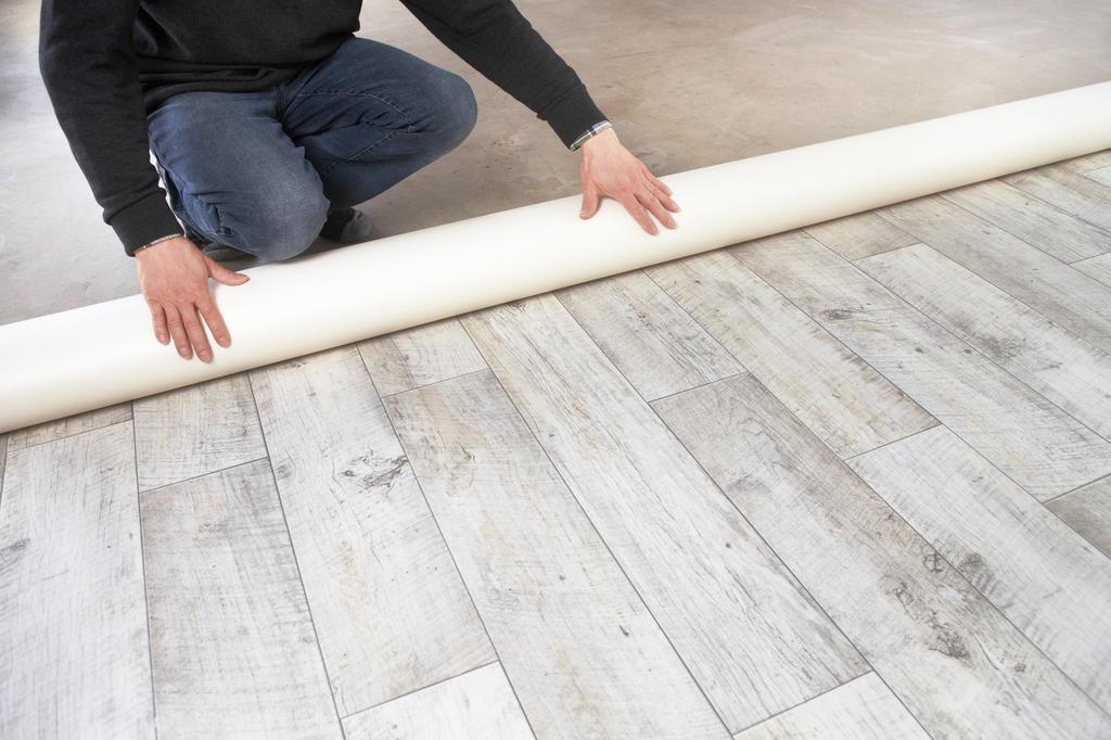 Затем монтажники уложат подложку прямо на черный пол. Эта подложка позволяет полу расширяться и сжиматься при изменении температуры и действует как звуко- и влагонепроницаемый барьер. Подложка обычно раскатывается и склеивается по швам. Установщики вырезают куски подложки там, где это необходимо, с помощью прецизионного универсального ножа, чтобы добиться идеальной подгонки.