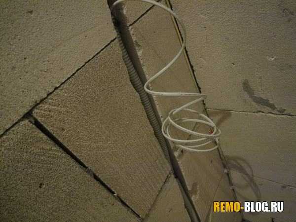 Далее нам нужно проштрабить стену и пол. Зачем? В этот канал ляжет гофра с термодатчиком, если термодатчик выйдет из строя, то его можно будет легко заменить в гофре не вскрывая основное покрытие. Ширина канала примерно 4 – 5 см, сделать лучше больше, в этот канал можно будет заложить и провода «питания» теплого пола. После штробления стены убираем все лишнее, в итоге получится вот такой вот канал.