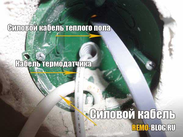 Итак, пол мы положили, нам его нужно проверить, для этого мы выводим провода в нашу коробку. Всего проводов получается три: питание которое подведено к нам в коробку, провод от термодатчика и силовой провод от теплого пола.