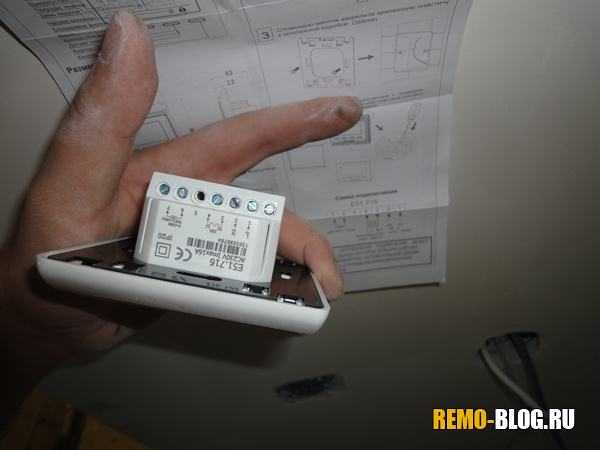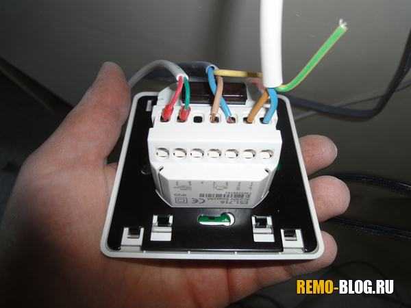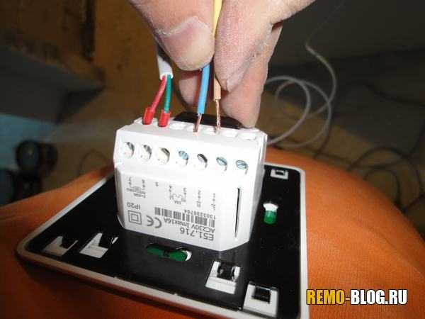 Следующее в монтаже теплого пола под плитку, это подключение терморегулятора. Сразу хочу сказать, что терморегуляторов тысячи, и они все разные, поэтому внимательно читаем куда какой провод устанавливать! У меня на самом терморегуляторе есть схема, поэтому мне проще. Также читайте — как выбрать терморегулятор.