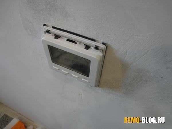 Можно уже обрезать лишние провода и установить терморегулятор в подрозетник. Можете задать вопрос — что же будет с каналом в стене со стороны душевой? Все просто, его закроют либо плиткой, либо штукатуркой.