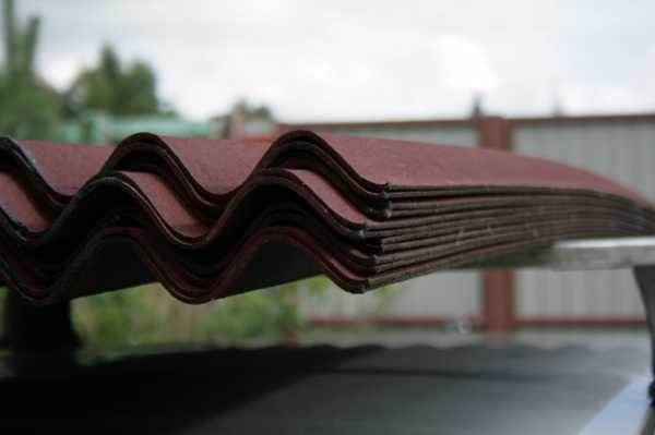 Технологический процесс покрытия крыши ондулином подразумевает следующее: из очищенных целлюлозных волокон формовали изделия с волнистой поверхностью, окрашивали их и пропитывали битумом. В результате получается материал с хорошими водоотталкивающими свойствами, устойчивый к резкой смене температуры, легкий, но способный выдерживать механические воздействия. Незначительный вес позволяет использовать материал для ремонта крыши без разбора старого покрытия.