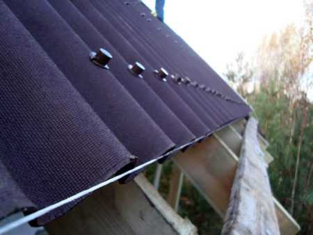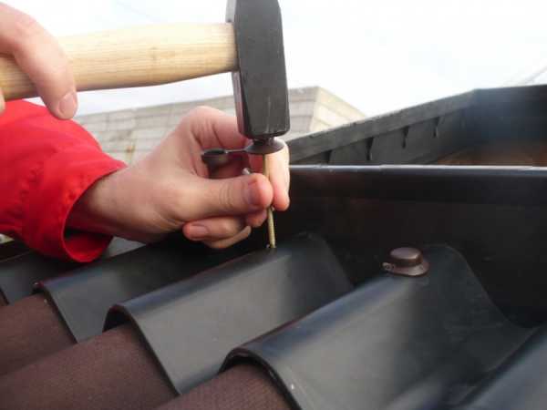 Ондулин фиксируется с помощью гвоздей со шляпками подобранными под цвет материала. В один лист вбивается 20 штук таких креплений. Располагают гвозди в конце каждого листа и в каждом месте нахлеста частей ондулина.