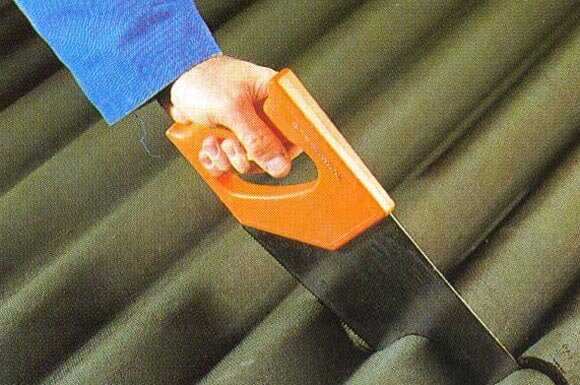 - При необходимости, перед тем как положить ондулин, можно распилить листы на фрагменты нужного размера. Это делается обычной ножовкой для дерева, хотя, можно использовать и циркулярную пилу. Чтобы пила работала легко, желательно смазать ее любым маслом.