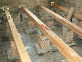 - Чтобы подпольное пространство не накапливало воду, от внутреннего засыпного слоя до древесной основы с помощью больших брусьев создается зазорное пространство, составляющее около пятнадцати сантиметров.