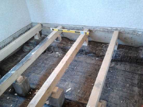 - Установка лаг и проверка горизонтальности перед укладкой пола