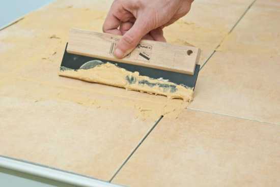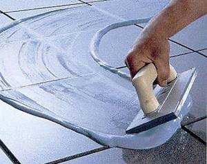 Затирка швов осуществляется при помощи резинового шпателя, путем равномерного втирания смеси в швы. После того, как нанесенная затирка полностью высохнет поверхность пола нужно протереть влажной губкой. Затем желательно взять что-либо округлое шириной чуть-чуть больше швов, например кусок провода, и провести по всем швам, осуществляя вдавливание затирки. После этой операции еще раз помойте полы.