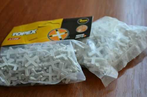 Между двумя соседними плитками устанавливаются крестики, помогающие зафиксировать ширину шва. Межплиточные швы нужны для того, чтобы впоследствии плитка не трескалась из-за тепловых расширений. К тому же они позволяют клеевому составу быстрее высохнуть.