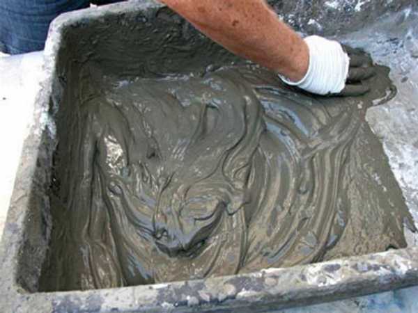 Во второй емкости смешивается пластификатор с водой. Для 50 кг цемента необходимо около 190 г пластификатора. Требуемый объем воды – 1/3 часть от массы цемента, то есть на 1/3 часть мешка необходимо 5,6 л воды (учитывая, что на пластификатор пойдет 0,6 литров). Затем смешиваются жидкие и сухие элементы, а потом в емкость с водой постепенно засыпается сухая смесь, при этом она хорошо размешивается.
