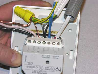 Нужно подключить все провода к терморегулятору согласно инструкцииПомимо регулятора температуры, нелишним будет приобрести и УЗО. А в случае, если используется несколько секций кабеля (в помещениях со сложной планировкой), то для каждого терморегулятора установить отдельный автоматический выключатель.