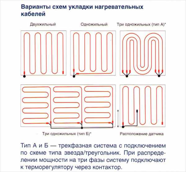 Схемы укладки кабеляЗдесь всё просто – работает он на основе электрического кабеля, укладываемого на чистый пол, который затем заливается стяжкой. Поверх этой конструкции можно уложить любое покрытие.