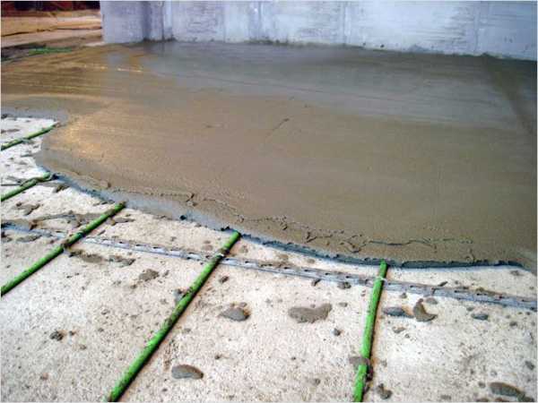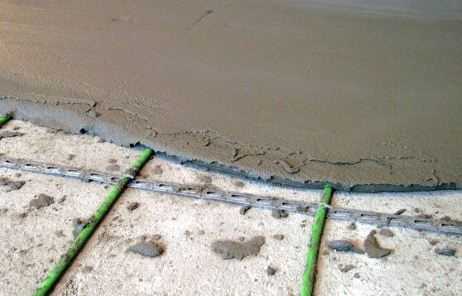 Если тестирование прошло успешно, можно приступать к заливке бетонной стяжки. Для нее используется цемент марки от М-300, в пропорции с песком 1:3. Толщина стяжки примерно 15-20 см. Если больше – снизится температура поверхности пола, а при меньшем значении появляется риск разрушения стяжки от нагревания.
