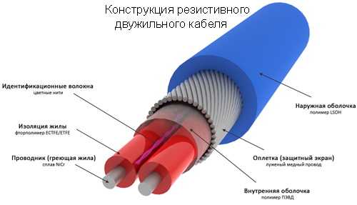 Во избежании поражения людей электрическим током, нагревательная жила покрывается слоем изоляции, сверху которой накладывается оплетка из металла. Эта оплетка служит заземлением и является экранирующей защитой от электромагнитных полей, которые возникают в результате работы. Все эти слои покрываются наружной изоляцией. Резистивные кабели могут иметь как одну, так и две жилы.