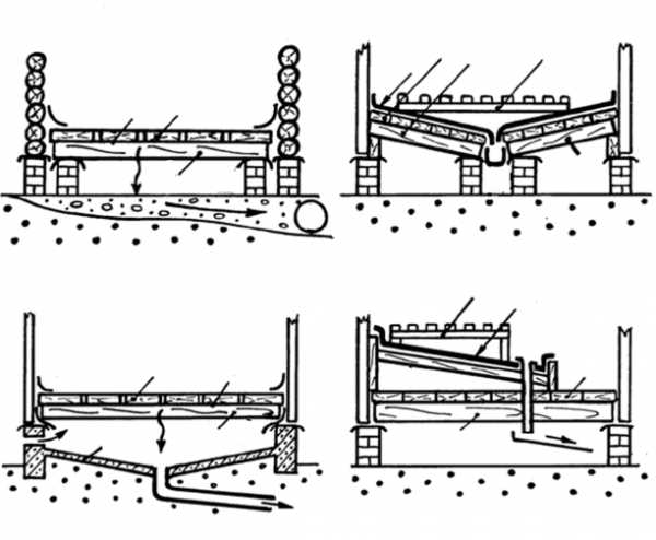 Для его обустройства сначала удаляют слой чернозема, уплотняют оставшуюся землю. На нее насыпают слой песка, хорошо трамбуют, проливают водой, сверху укладывают щебенку. Делают настил под легким наклоном к стене или воронки: чтобы вода быстрее стекала в водосборник. Впрочем, некоторые строители уверены, что наклон необходим только для непротекающих полов. Специалисты предупреждают: лучше сначала устанавливать приемную емкость, затем устраивать бетонную стяжку, а сверху укладывать гидроизоляцию. Гидроизоляция потребуется и столбикам, на которых позже установятся лаги. Обычно такие столбики делают из кирпича или камня, установленных на бетонной подушке. Пока вся конструкция сохнет, рекомендуется обязательно несколько раз пропитать доски специальным составом, предупреждающим гниение и появление плесени. Затем эти доски укладывают на лаги, соблюдая следующие тонкости: