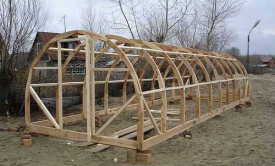 - Для деревянных зимних теплиц рекомендуется использовать брус 100-150*100-150 мм, вертикальные опоры должны располагаться на 1,5-2 м друг от друга, стропильная система выполняется из доски 40*100-150 мм, так рекомендуют нормативные правила для хозпостроек.