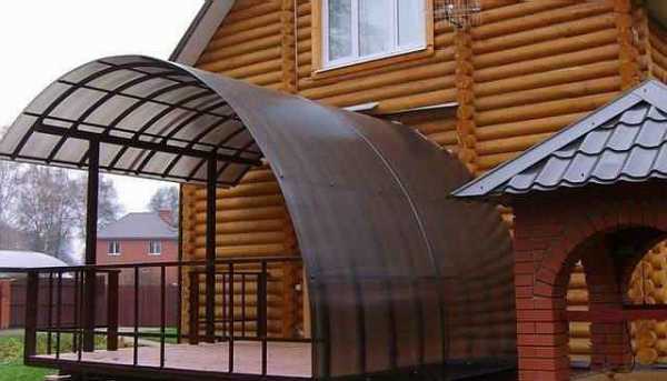 Вместо односкатной кровли в качестве навеса над террасой и верандой из монолитного поликарбоната можно использовать арочную конструкцию. Не забывайте о том, что этот материал легко сгибается по большому радиусу. Поэтому он отлично ложится на каркас криволинейной конфигурации.