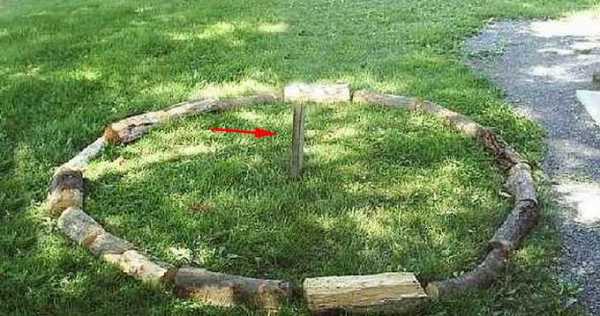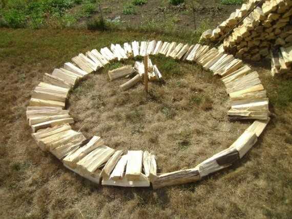 Первый этап – выравнивание площадки и вычерчивание круга, по которому будут складываться поленья. Сделать его можно с помощью кола, вбитого землю и веревки, привязанной к нему. Прикрепив к ее концу острую щепку или кусок арматуры, на земле прочерчивают окружность.