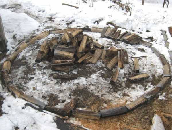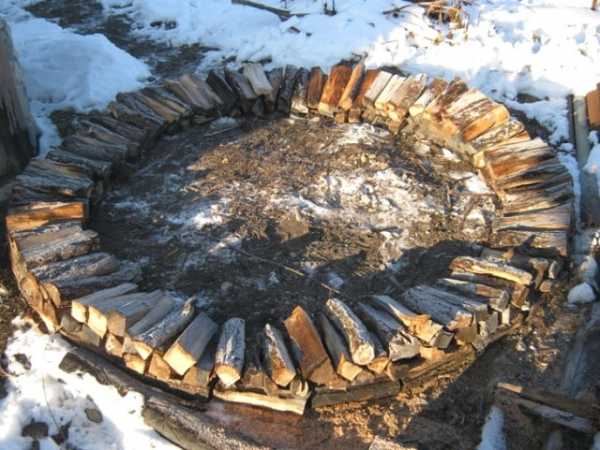 Второй этап – укладка базы. Для этого по периметру линии разметки уложите колотые дрова друг за другом.