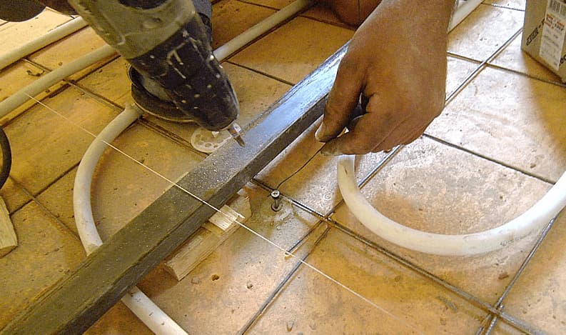 В случае если вы ставите более двух маяков для стяжки вашего пола, вам придется чаще производить замеры плоскости средних направляющих. Для облегчения этой задачи, между крайними маячковыми линиями натягивают шнурок, по которому поправляют потом средние направляющие.