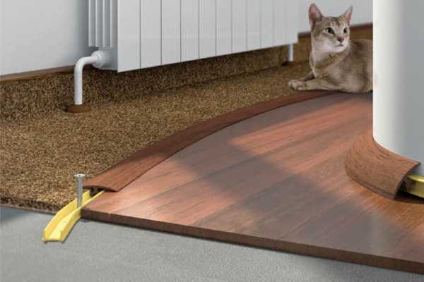 Фурнитура крепится к черновому полу дюбелями или саморезами на одном уровне с обоими покрытиями. Лучше делать это скрытым способом, чтобы спрятать крепеж под декорирующей планкой.