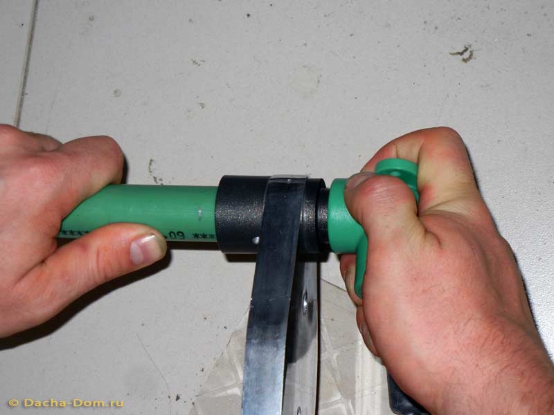 Важно получить ровный торец, чтобы труба равномерно вошла в фитинг и одинаково спаялась по всему диаметру. Если отрезать косо, то выпирающая часть войдёт слишком глубоко и расплавленный полипропилен выдавится, уменьшив внутренний диаметр фитинга.