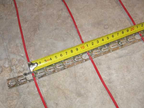 Теперь уложите и закрепите на подготовленную поверхность пола монтажную ленту. И отметьте на ней шаг укладки кабеля. Помните, Вы высчитывали его раньше?