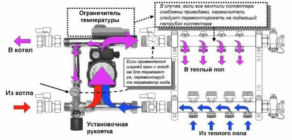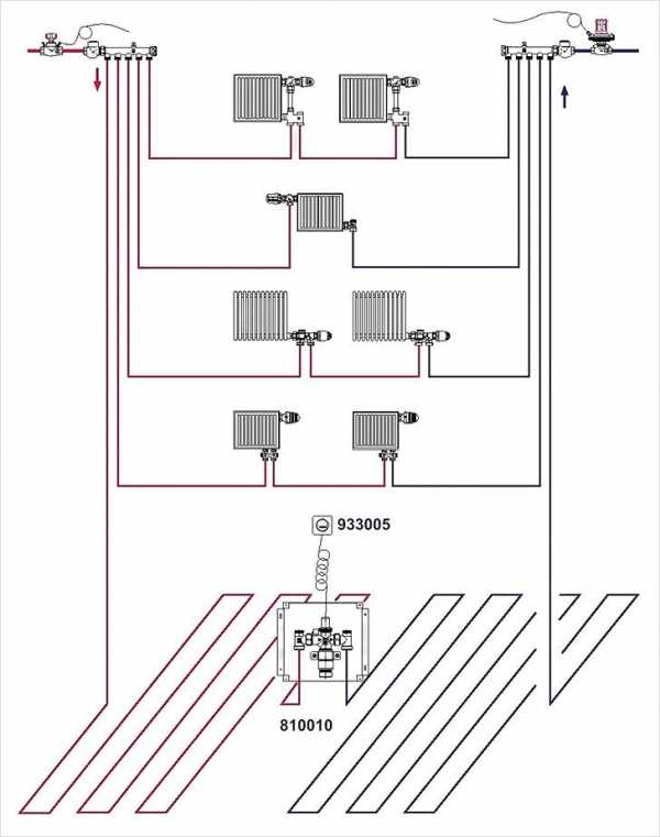 Порядок подключения системы обогрева предельно прост. Его суть заключается в том, что теплый пол подключается к уже имеющейся системе отопления. Если квартира находится на первом этаже, система врезается в верхнюю разводку отопления. В случае расположения квартиры на выше идущих этажах, теплый пол нужно подключать к нижней разводке отопительной системы.