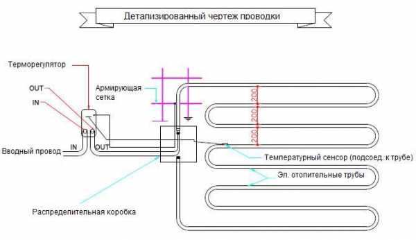 Затем в этом же масштабе, рисуется нагревающий контур. Две клеточки — 20 см, как раз шаг магистралей. Благодаря такой схеме, и в витках потом не ошибётесь, и длину трубы высчитаете с минимальной погрешностью.