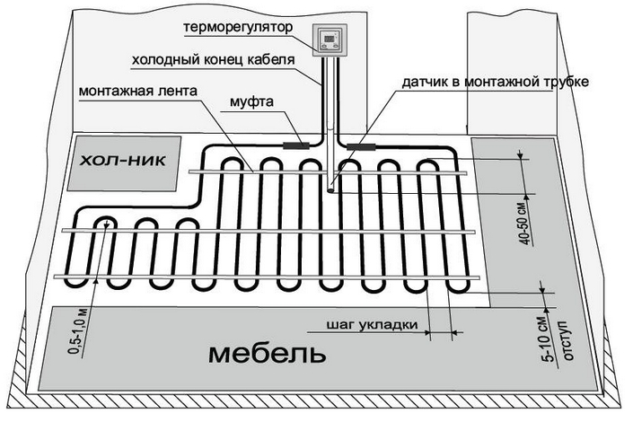 Следует отметить, что двухжильный кабельный пол более прост в монтаже, так как уже имеет готовый конец для подключения к электросети. А конец одножильного кабеля после укладки необходимо вернуть к месту подключения (закольцевать).