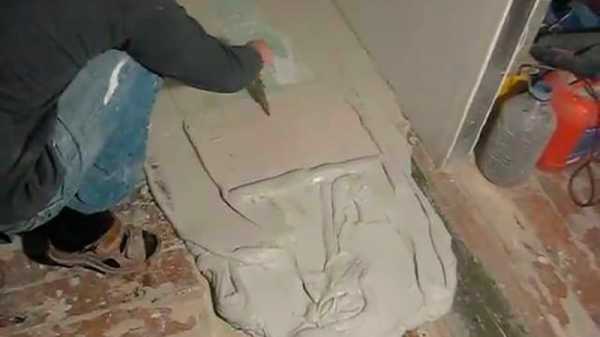 - Замешиваем раствор, в который добавляем воды немного меньше, чем необходимо по инструкции, так как масса должна получиться густой. Вдоль нитей укладываем ряд комков из раствора, накладываем на них рейки, причем их верх должен точно совпасть с ниткой. После того, как смесь застынет, очищаем от неё верх реек, а затем ждем, пока она совсем высохнет.