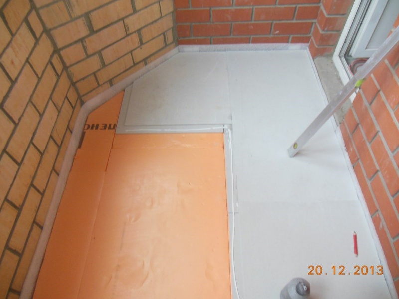 В качестве морозостойкой прокладки специалисты советуют выбрать лёгкий пеноплекс или пенополистирол (подробнее в статье «утепление пола на балконе пеноплексом«). При таком способе уровень балконного пола сильно поднимается, зато он обеспечивает хорошую шумоизоляцию и тёплые зимы.
