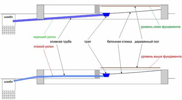 Если вы возводите баню на ленточном фундаменте, то выход сливной трубы и места ее прохода через внутренние ленты следует предусмотреть уже при его заливке, рассчитав уклоны, а то и заложив ее в него сразу.