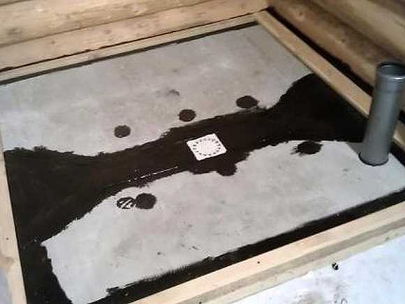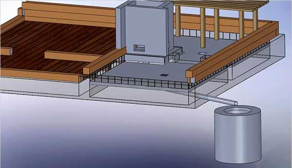 - Основания фундамента оборудуется цементным покрытием (плитами) или деревянными досками с фасками. Резервуар под жидкость так же может быть изолирован от грунта. В ёмкость монтируется ПВХ труба для слива. Черновой пол обычно делают под направленным уклоном к водному резервуару.