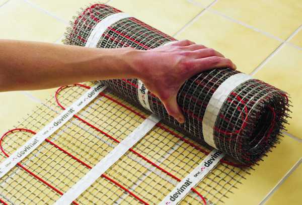 Кабельный и водяной теплый пол в доме приподнимает уровень основания минимум на 7 см. Чтобы этого избежать, следует приобретать систему электрических матов. Она выглядит в виде полимерной сетки (шириной чаще всего 50 см). На ее поверхности разложен с требуемым шагом электрический провод. Он имеет толщину всего 3 мм.