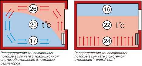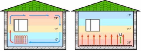 Распределение температур в помещениях при разных типах отопленияТакая циркуляция воздуха подразумевает, что тёплый воздух находится вверху, холодный внизу. Недостатком подобного способа обогрева будут холодные полы, вследствие чего возможно, что начнут мёрзнуть ноги. Для устранения такого недостатка используется система тёплых полов, конечно, не такая, как в Древнем Риме, а основанная на несколько других подходах к обогреву. Какой тёплый пол лучше при этом, можно определить самостоятельно, по результатам обзора имеющихся систем.