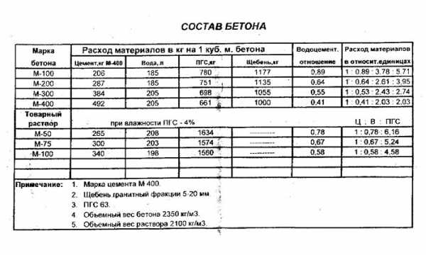 В основном у проектировщиков пользуется популярностью марки бетона М100-М400. Плотность такого материала составляет 1950-2500 кг/м?. Если не вдаваться в дебри сложных изысканий, то вполне можно воспользоваться подготовленными результатами типовых исследований: