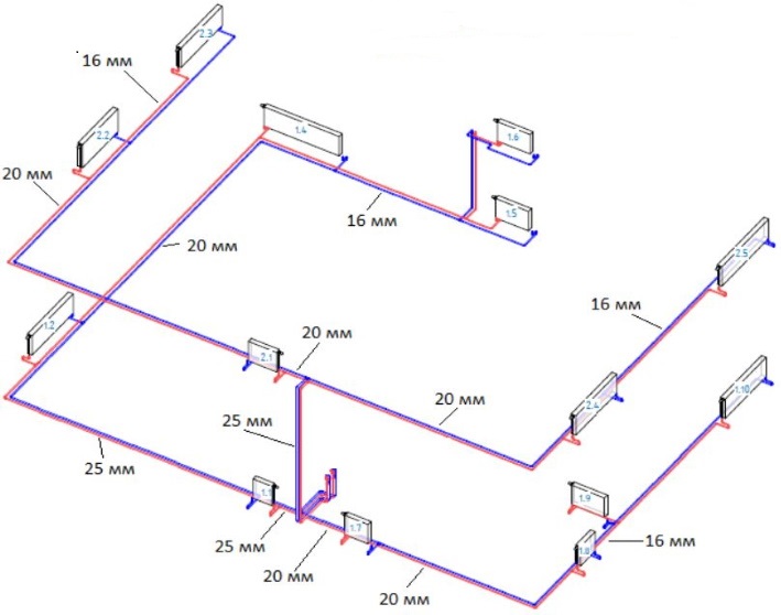 Но с большой долей вероятности можно утверждать, что если требуемая тепловая мощность контура, например, 12 кВт (площадь около 120 м. кв.), то разводку системы отопления с принудительной циркуляцией нужно проводить пластиковыми трубами диаметром 32 мм.