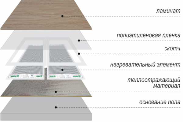 - В целях увеличения эффективности подогрева пола под пленку укладывается отражающая теплоизоляция. В случае с ламинатом она одновременно выполняет функцию подложки.