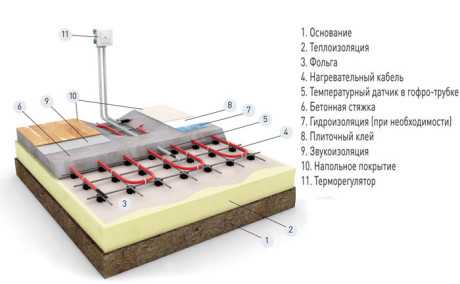 Лучше всего сделать качественную цементно-песчаную стяжку (ЦПС) общей толщиной около полуметра. Такой слой необходим для укладки кабеля (15-20 см стяжки + кабель + еще 30 см раствора). Чтобы тепло не уходило вниз, необходимо позаботиться о гидроизоляционном слое с обязательным утеплением. Полное застывание такого слоя происходит через месяц после выполнения работ. Затем укладывают керамическую плитку.