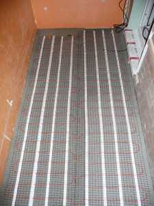 - В качестве термоносителя выступает одно- или двухжильный кабель в оплетке. Укладывается секциями на сетку из арматуры или монтажной ленты либо применяются готовые рулонные маты. Сверху такой пол заливается цементно-песчаной смесью. Поверх стяжки располагается паркет, паркетная доска, линолеум, виниловая или кафельная плитка, ковролин; не рекомендуется использовать под ламинат.