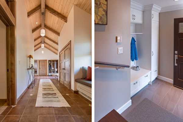 Прихожая в дачном домике удивляет не только своими габаритами, но и по-деревенски душевным дизайном. Основной акцент здесь сделан на теплые тона природных материалов и рустикальный стиль. Керамическая плитка в имитации каменных поверхностей выглядит очень реалистично, а искусственные потертости на ней добавляют натуральности, которую не спрятать под ковром. Очаровательный во всех отношениях интерьер.