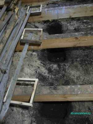 Одним из этапов работ считается заливка фундамента под столбики.- Копают небольшие котлованы для бетонных подушек площадью 40×40 см и глубиной 30 см на месте вбитых контрольных колышков в подполье.