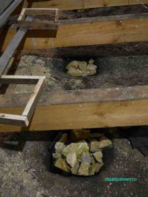 Утеплитель нужно использовать «дышащий», лучше всего, применять минеральную вату, но укладывать ее не плотняком до верха, а оставив зазор. Можно также использовать керамзит, опилки, хвою и другие подобные материалы.