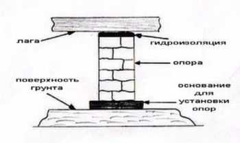 В местах разметки выкапывают грунт под столбики глубиной 30 см, формируя квадратные углубления 40×40 см. Делают в них опалубку, выступающую над землей на 5 см. На дно засыпают подушку из песка, сверху заливают бетон. Дают бетону высохнуть сутки. Получают фундамент опоры, которая возвышается над землей как столбики красного кирпича под лаги, однако, чтобы соорудить такую опору укладывают (кладут выложить класть) несколько слоев материалов.