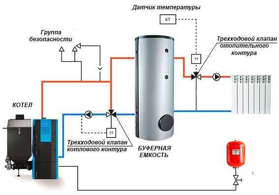 Следующий пример использования и подключение этой важной детали – обвязка твердотопливного теплогенератора и буферной емкости, являющейся аккумулятором тепла. Чтобы прогреть ее целиком достаточно быстро, температура подаваемого теплоносителя должна быть от 70 до 85 °С, каковая вовсе не нужна в системе радиаторного отопления. Понизить ее как раз и помогает трехходовой клапан, установленный за емкостью вместе с отдельным циркуляционным насосом.