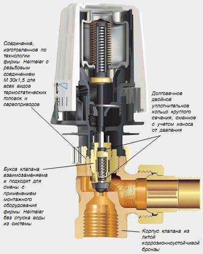 - Основной деталью термоголовки является температурный датчик, который считывает температуру и посредством системы капилляров передает управляющие сигналы приводу устройства. В зависимости от показаний датчика привод либо открывает, либо закрывает клапан.