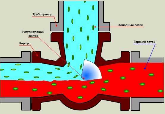 Термостатический смесительный клапан обеспечивает смешивание двух потоков разной температуры в один. Он имеет три хода, через один подается горячая вода, через другой – холодная, а через третий, после смешивания, выдается теплая вода. Если жидкость, которая движется по горячему потоку, имеет допустимую температуру, то холодный поток полностью перекрывается.