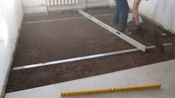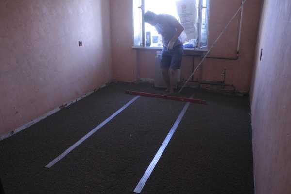 Расстилается гидроизоляционная пленка для пола с напуском на стены и нахлестом на соседствующие полоски. Устанавливаются металлические маяки, в соответствии с которыми в последующем производится укладка засыпки. Укладывается керамзитовая засыпка (на 1 кв.м. расходуется в среднем около 1 мешка материала при 5-сантиметровом слое).