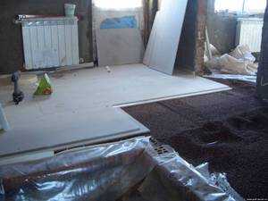 Также рекомендуется позаботиться об устройстве звуковой изоляции. Она позволяет не только избежать образования звуковых мостиков, но еще и предотвращает дальнейшую деформацию полового покрытия во время теплового расширения. Дабы установить звукоизоляцию, между стенами и плитами ГВЛ оставляем незначительный зазор (порядка десяти сантиметров), куда впоследствии и будет помещаться теплоизолирующий материал.